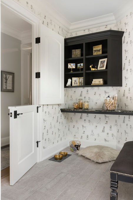 Retractable screens allow the homeowners to enjoy the lake-facing sunroom in any season. The sunroom uses casual materials that are easy to maintain, like the stone floors, dark wood ceilings, and woven rattan furniture. And they even designed a special room just for the family dog!